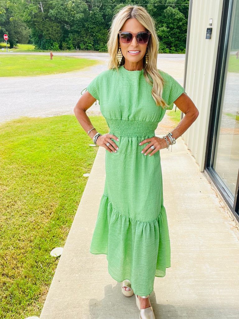 Solid green texture dress with a round neck, elastic waist, back cut outs with ties, and an inside lining. Runs true to size and a small is shown in the picture.