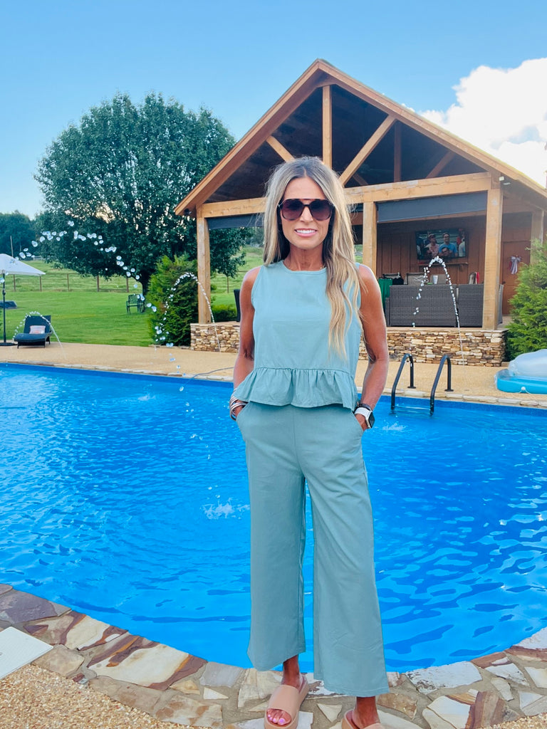 LINEN Ruffle sleeveless top with round neck and button back closure. Elastic waist pants with wide leg and front pockets.. Makes the perfect set Runs true to size. Small shown in picture.