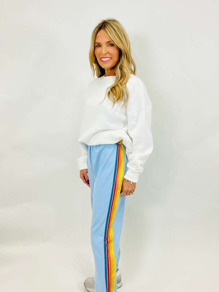 Blue joggers with multicolor stripe detail and an elastic waistband. Runs true to size and a small is shown in the picture.