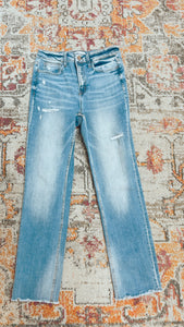 Medium wash crop jeans with little distressing and raw hem. Runs true to size and small shown in the picture.